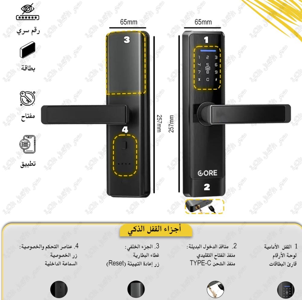 حل قوي ومريح! يعمل على 4 بطاريات مقاس AA . تأكد من عدم نفاد الطاقة ولا تقلق في حال نفادها حيث بإمكانك الدخول عن طريق المفتاح التقليدي أو تشغيل القفل عن طريق منفذ الـ TYPE C للدخول الطارئ وليس لشحن القفل