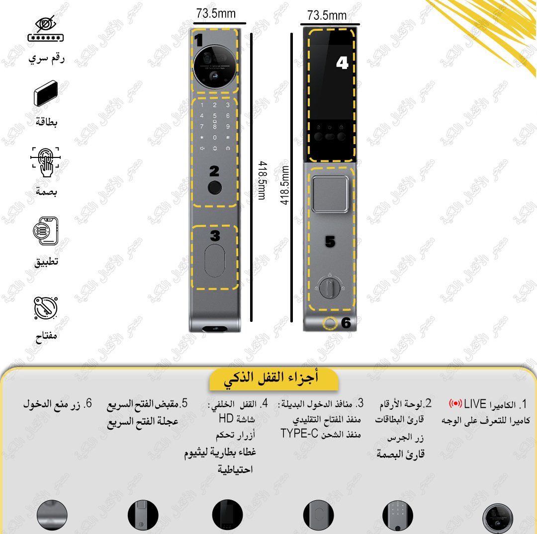 👤 تقنيات بصمة + وجه + بطاقة + رمز سري لمنع الدخول غير المصرح.